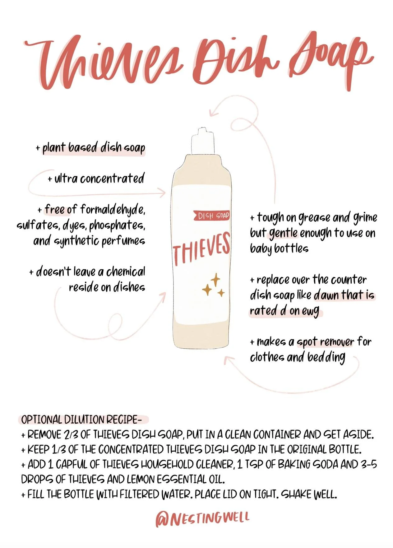 There are 2 other Thieves Cleaning Products I LOVE and am never without: Thieves Dish Soap & Thieves Laundry Soap (FUN FACT: in a pinch, you can use your Thieves all-purpose cleaner for both of these!)